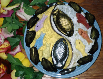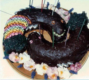Inside a buttery crust is a rich fudge tart shaped as a serpent. Covered with dark chocolate and adorned with european candies. The symbolism behind this cake is the two halves of one whole, the masculine and the feminine. |