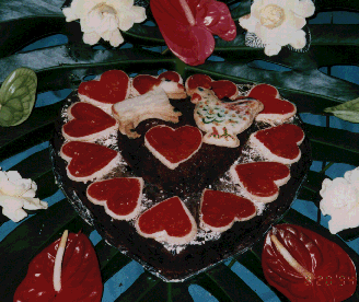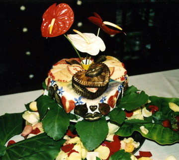 This is a traditional English Wedding Cake. Six months prior to baking, Currants, raisins, orange and lemon peel are soaked in brandy. Molasses, chocolate and these candied fruits make a rich fruitcake that can be saved in a tin for the year anniversay. This is where the tradition began before the freezer. This wedding cake is decorated with a rooster and a horse to symbolize the Bride and grooms chinese astrology. Shortbread hearts surround the couple.