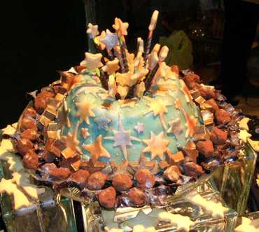A ginger cake covered with marzipan and arranged with shortbread comets, chocolate truffles and candied ginger stars. Out of the cake'scenter come shooting stars on the end of a chocolate wand. This cake was auctioned off in Glen Ellen, CA to raise money for the Dunbar School.
