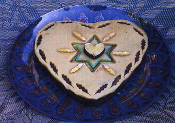 Dark chocolate cake made with Matzo Meal for the Passover Seder. At the center is a Star of David made of marzipan with a solid chocolate heart covered in gold leaf. |