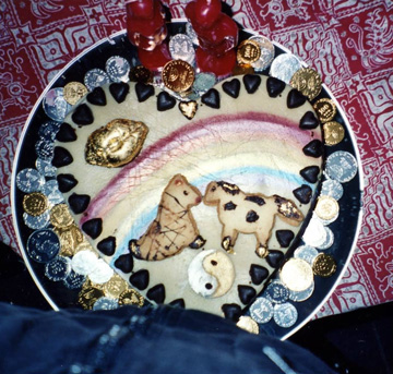 A buttery pound cake, layered with ricotta cheese and shaved chocolate and lemon zest. Iced with ganache and hand painted marzipan. This cake was made to celebrate forty years of marriage. The dog and horse represent the couple's chinese astrology signs. Surrounding the couple is love in the form of hearts and kisses. The yin and yang is representative of the female and male united. The cake sits on a bed of chocolate coins to bring abundance.