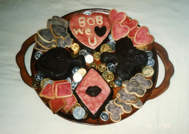Four lemon pound cakes filled with lemon curd, iced with chocolate. The cakes and shortbread cookies which represent the four suits, Diamond, Heart, Spade and Club, are nestled amongst the chocolate coins.